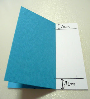 Die Gutscheinlasche (hier türkis) in der Mitte falten (= 5 x 8,5cm), an der geschlossenen Kante von beiden Seiten nach einem cm eine Markierung anbringen,...